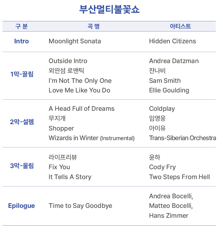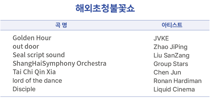 불꽃쇼에 사용되는 음악도 미리 알고 간다면 더 감동적인 불꽃쇼를 즐길 수 있을 것이다.