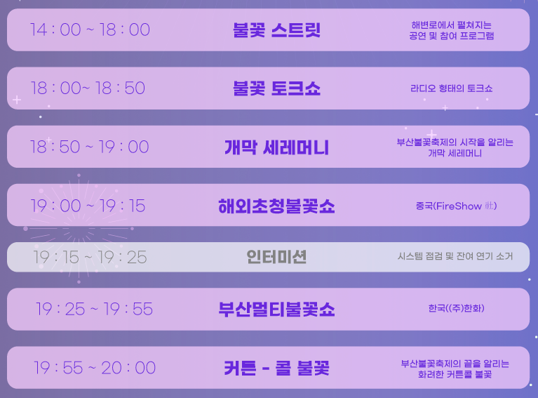 올해는 부산의 바다와 어우러진 화려한 불꽃들이 더욱 풍성하게 준비되어 있다고 한다.