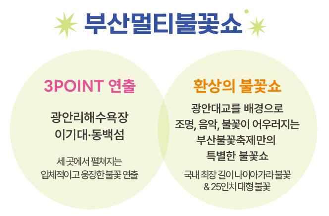 부산불꽃축제만의 특색있는 환상의 불꽃쇼와 광안리해수욕장, 이기대, 동백섬의 3 곳에서 펼쳐치는 불꽃을 연출한다.