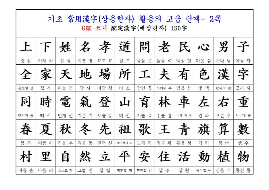 = 7급 배정한자 150자 + 준6급 신습한자 150자